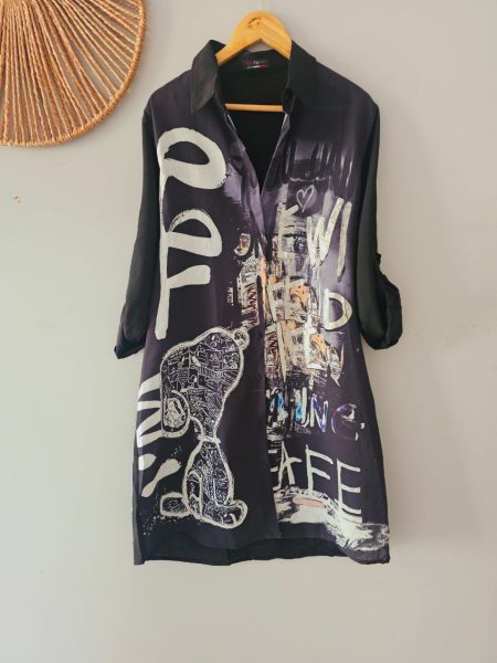 Maxi camisero italiano » Baddy» mezclilla, aplicaciones, piedreria incorporada, bolsillos laterales, caida total