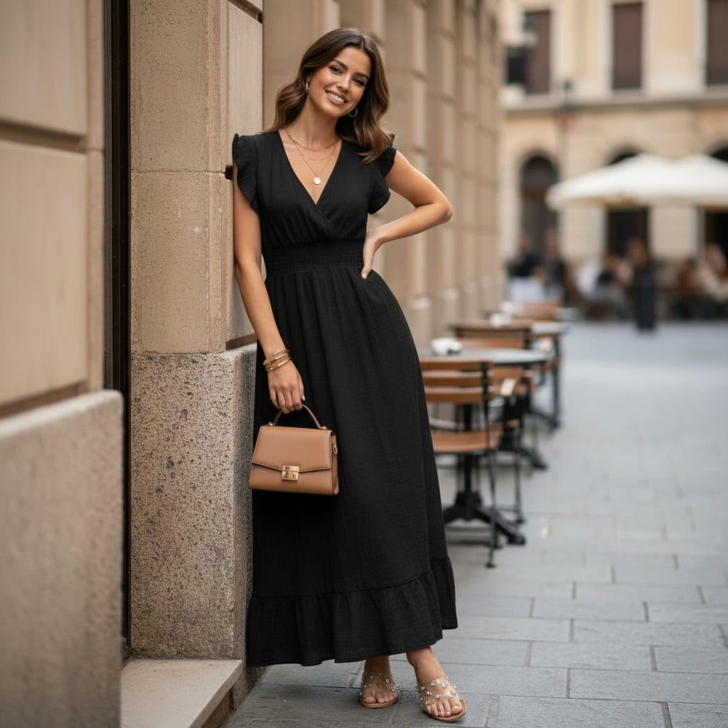 Maxi vestido » Leonor» Creep, elasticado, diseño vuelos, caida total